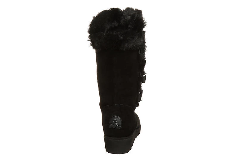 Wedge your cold weather runs in the Bearpaw Genevieve women’s fur boot. With a suede upper accented by decorative side buckles and a faux fur collar, these boots are sure to keep your feet warm and secure. Feel even better with the comfort shearling footbed and slight wedge heel.