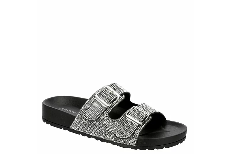 Slide on this Teddy-R women’s sandal by madden girl and add a touch of chic to your ensemble. With a sequined upper, these rhinestone sandals give a modern pop to the classic dual-buckle style. The contoured insole supports your foot with each step.